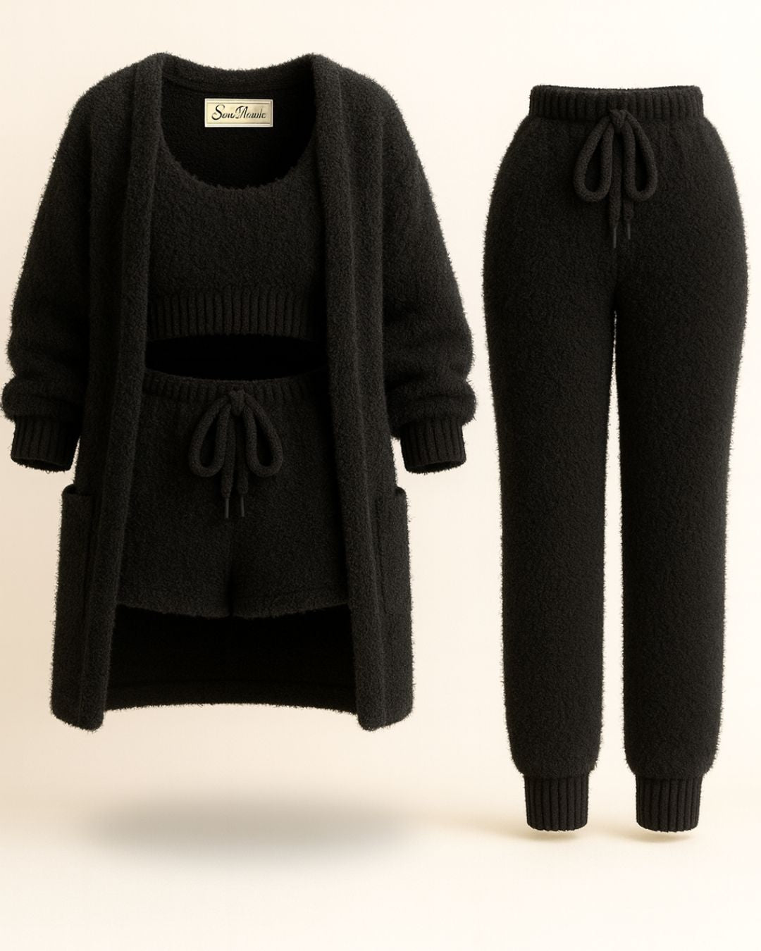 Ensemble composé de : un haut, un short, un pantalon et une veste à capuche.