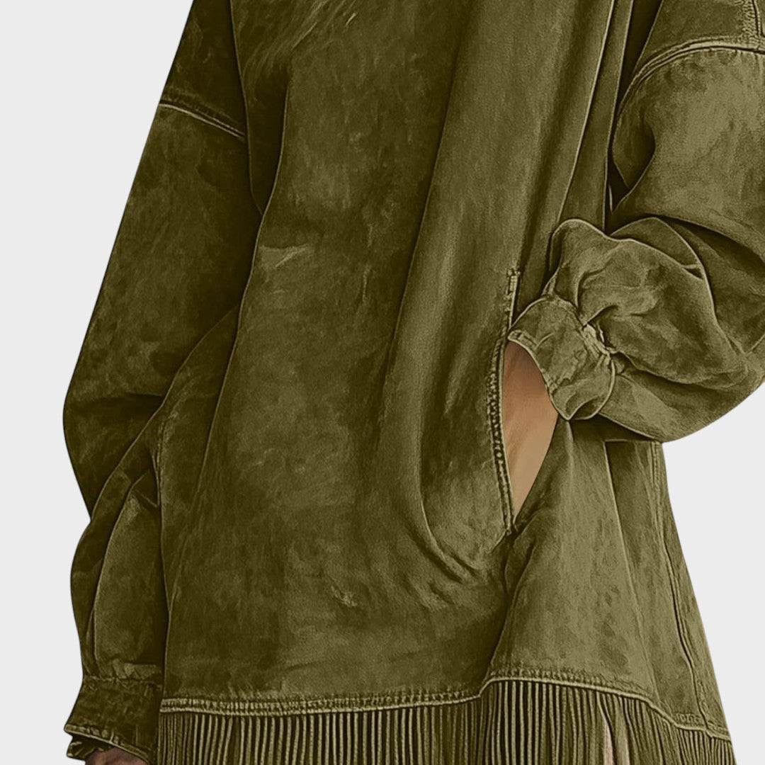- Diseño sofisticado y elegante: El vestido Sheri está confeccionado en ante, con un tacto suave y sofisticado, perfecto para quienes buscan un look moderno y refinado. El fleco en el bajo le añade un toque único y con estilo.
